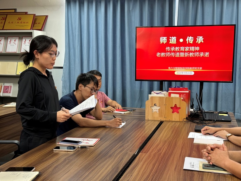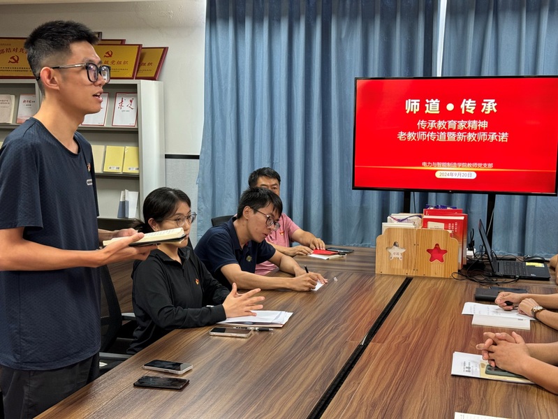 為了學(xué)習(xí)貫徹黨的二十屆三中全會(huì)精神,大力弘揚(yáng)教育家精神,加快建設(shè)教育強(qiáng)國(guó),9月20日下午在西1-514A會(huì)議室,電力與智能制造學(xué)院教師黨支部組織召開(kāi)全體教師大會(huì),開(kāi)展“師道傳承”——老教師傳道暨新教師承諾活動(dòng),學(xué)院黨總支書(shū)記、院長(zhǎng)褚玉峰及全體教師參加了會(huì)議,會(huì)議由教師黨支部書(shū)記孫令真主持。