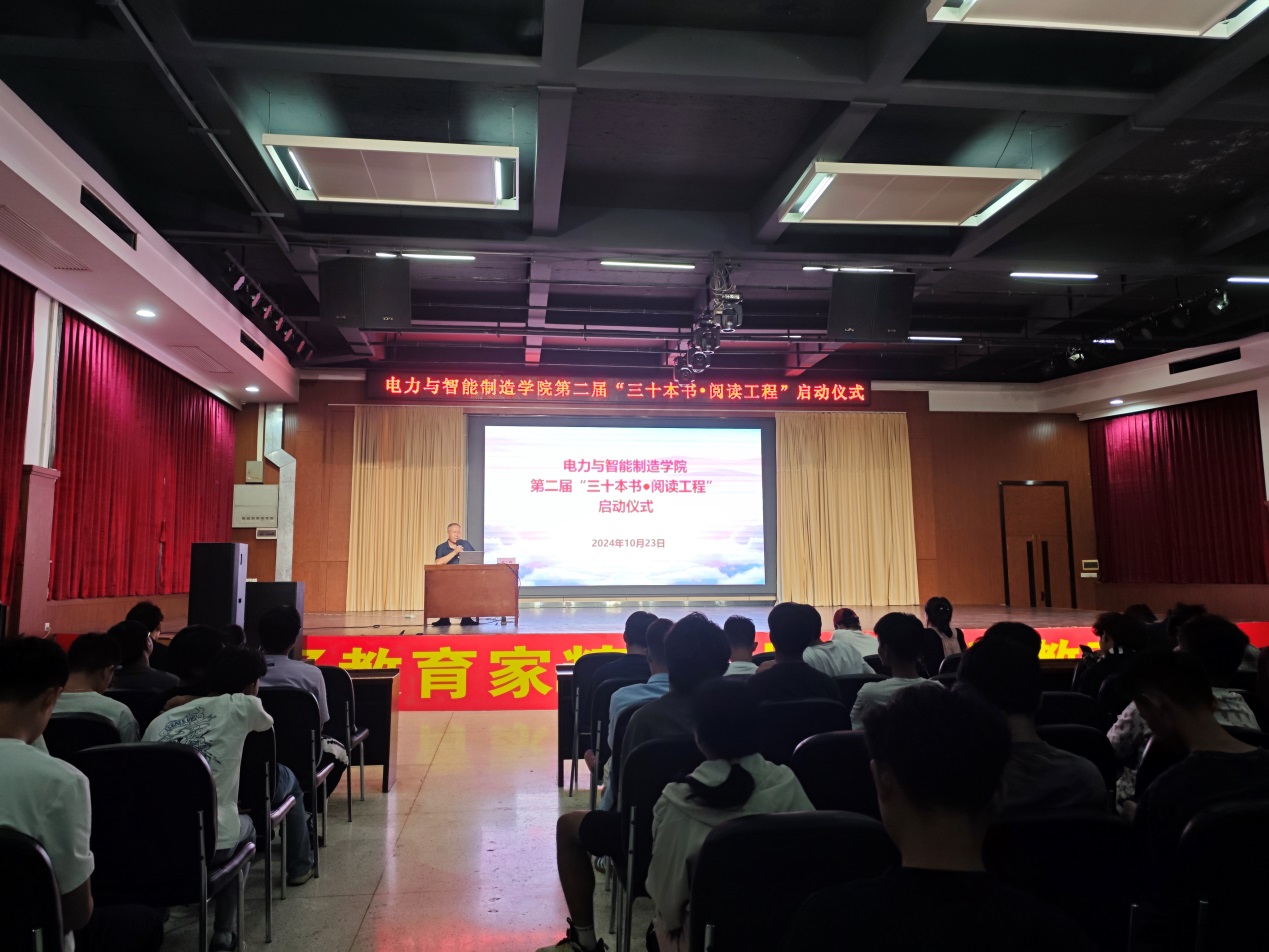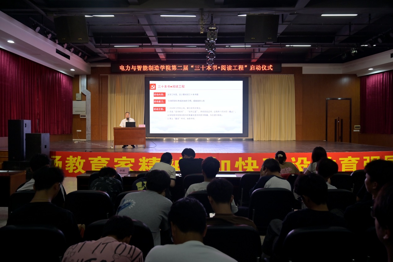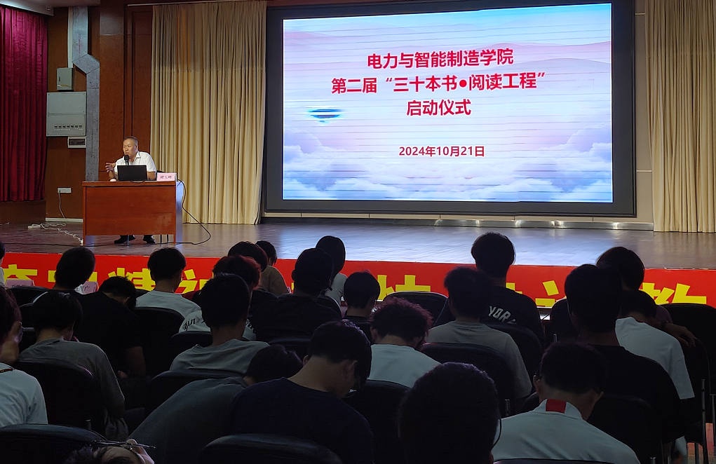 為持續(xù)開展好“儒雅電力人”文化育人項目建設(shè),電力與智能制造學(xué)院黨總支于10月21日和10月23日,分別兩場在圖書館8樓,開展第二屆“三十本書?閱讀工程”啟動儀式。學(xué)院黨總支書記、院長褚玉峰、黨總支專職副書記鄭理廣、學(xué)院團(tuán)委書記鐘穎、輔導(dǎo)員劉浩、鄒思敏、伍景太、郭曉倩、王曼霞及學(xué)院2024級全體同學(xué)參加了這次啟動儀式。