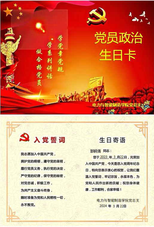 作為電力與智能制造學(xué)院學(xué)生黨支部的一名輔導(dǎo)員郭曉倩,3月22日早上,收到了學(xué)院黨組織發(fā)的“政治生日”賀卡,心情特別興奮,2023年3月22日是我光榮加入中國共產(chǎn)黨的日子。