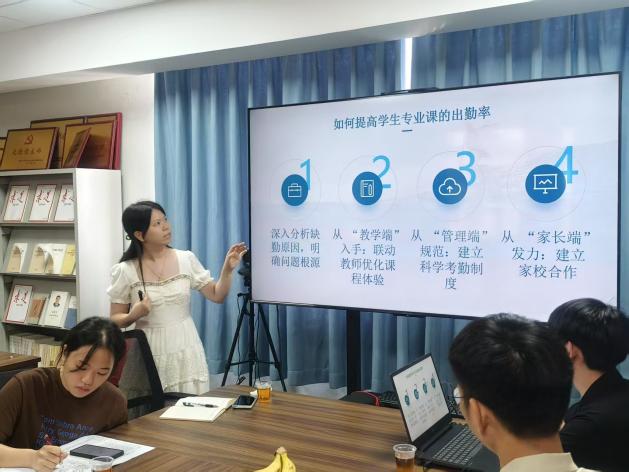 輔導(dǎo)員王曼霞老師分享了如何提高學(xué)生專業(yè)課的出勤率。從分析問題根源、教學(xué)端、管理端、家長端四個方面進(jìn)行講解。強(qiáng)調(diào)提高學(xué)生專業(yè)課出勤率是保障教育效果、促進(jìn)學(xué)生全面發(fā)展的重要條件之一。