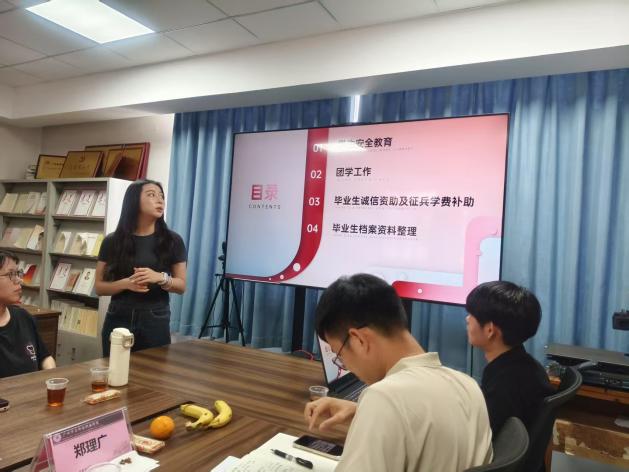 輔導(dǎo)員鐘穎老師分享了學(xué)生安全教育、團(tuán)學(xué)工作、畢業(yè)生誠信資助及征兵學(xué)費補助、畢業(yè)生檔案資料管理。她強(qiáng)調(diào),在活動中應(yīng)注重提高同學(xué)們的參與積極性,從而實現(xiàn)教育成果的最大化。