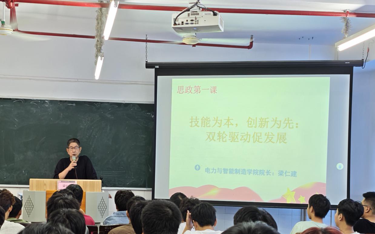 根據(jù)學(xué)校黨委的安排部署,電力與智能制造學(xué)院黨總支在西一教學(xué)樓303課室組織開展“思政第一課”。本次課程以“技能為本、創(chuàng)新為先:雙輪驅(qū)動(dòng)促發(fā)展”為題目,由學(xué)院梁仁建院長(zhǎng)主講,學(xué)院副院長(zhǎng)孫令真、學(xué)院團(tuán)委書記王明偉老師和學(xué)院24級(jí)學(xué)生代表及25級(jí)新生代表共同參與學(xué)習(xí)。