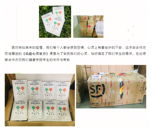 在此次疫情期間,健康學院的合作方深圳市雙佳醫(yī)療科技有限公司贈送一批有關于疫情的心靈書籍給予我們,主要為分發(fā)給學生閱讀學習,同時部分書籍也將存放于圖書館,給予全校師生借閱