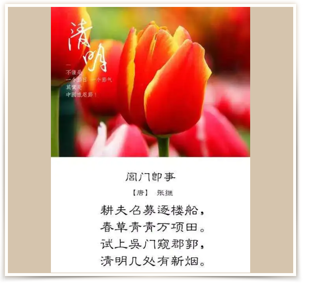 不知不覺(jué),我們已經(jīng)進(jìn)行線(xiàn)上教學(xué)一個(gè)多月。轉(zhuǎn)眼間又迎來(lái)了四月,而在此清明節(jié)也即將來(lái)臨。清明節(jié)是中華民族古老的節(jié)日,既是一個(gè)掃墓祭祖的肅穆節(jié)日,也是人們親近自然、踏青游玩、享受春天樂(lè)趣的歡樂(lè)節(jié)日。