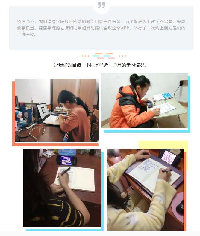 健康學院于2020年4月3號晚,借助騰訊會議這個APP在線上進行關(guān)于健康學院網(wǎng)絡課程建設工作的會議。出席的成員有:李君副院長、李桂林院長助理、學管主任宋依謎老師、教學主任胡筱蕾老師、輔導員及各班的班干均受邀于此次會議。