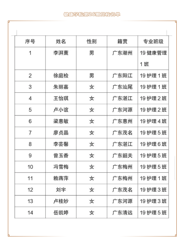 根據(jù)學(xué)校黨委相關(guān)文件規(guī)定,經(jīng)學(xué)生本人申請、團支部推薦、輔導(dǎo)員推薦、黨支部考察、黨總支研究決定、擬將我院李湃薰等14名同學(xué)列為第26期黨校培訓(xùn)班學(xué)員,現(xiàn)將本次培訓(xùn)班學(xué)員的名單公示如下(具體名單見下表)