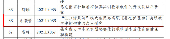根據(jù)《關(guān)于申報2021年度高等職業(yè)院校醫(yī)藥衛(wèi)生類專業(yè)教學(xué)改革項(xiàng)目的通知》和《關(guān)于開展 2019-2021 年度高職院校醫(yī)藥衛(wèi)生類專業(yè)優(yōu)秀論文評審?fù)ㄖ芬?,廣東省高等職業(yè)院校醫(yī)藥衛(wèi)生類專業(yè)教學(xué)指導(dǎo)委員會開展了2021年度醫(yī)藥衛(wèi)生類專業(yè)教育教學(xué)改革項(xiàng)目申報以及論文評審工作,經(jīng)專家評審,共立項(xiàng)125項(xiàng),同時評選出90篇優(yōu)秀教學(xué)論文和42篇優(yōu)秀科技論文。其中我校胡筱蕾的校級課題《“TBL+情景制”模式在民辦高職<基礎(chǔ)護(hù)理學(xué)>實(shí)踐教學(xué)中的構(gòu)建與應(yīng)用研究》成功立項(xiàng)為廣東省高等職業(yè)院校醫(yī)藥衛(wèi)生類專業(yè)教學(xué)指導(dǎo)委員會2021年度教育教學(xué)改革課題,同時胡筱蕾老師參與評審的兩篇科技論文《45歲以上農(nóng)村地區(qū)成年人健康自我管理能力影響因素》和《新形勢下以全科醫(yī)學(xué)理念為基礎(chǔ)的老年人群醫(yī)養(yǎng)結(jié)合的思考》均獲得2021年廣東省高等職業(yè)院校醫(yī)藥衛(wèi)生類專業(yè)優(yōu)秀科技論文二等獎稱號。名單如下。