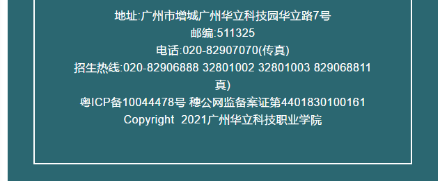 地址:廣州市增城廣州華立科技園華立路7號 | 郵編:511325 | 招生熱線:020-82906888 32801002 32801003 82906881(傳真)