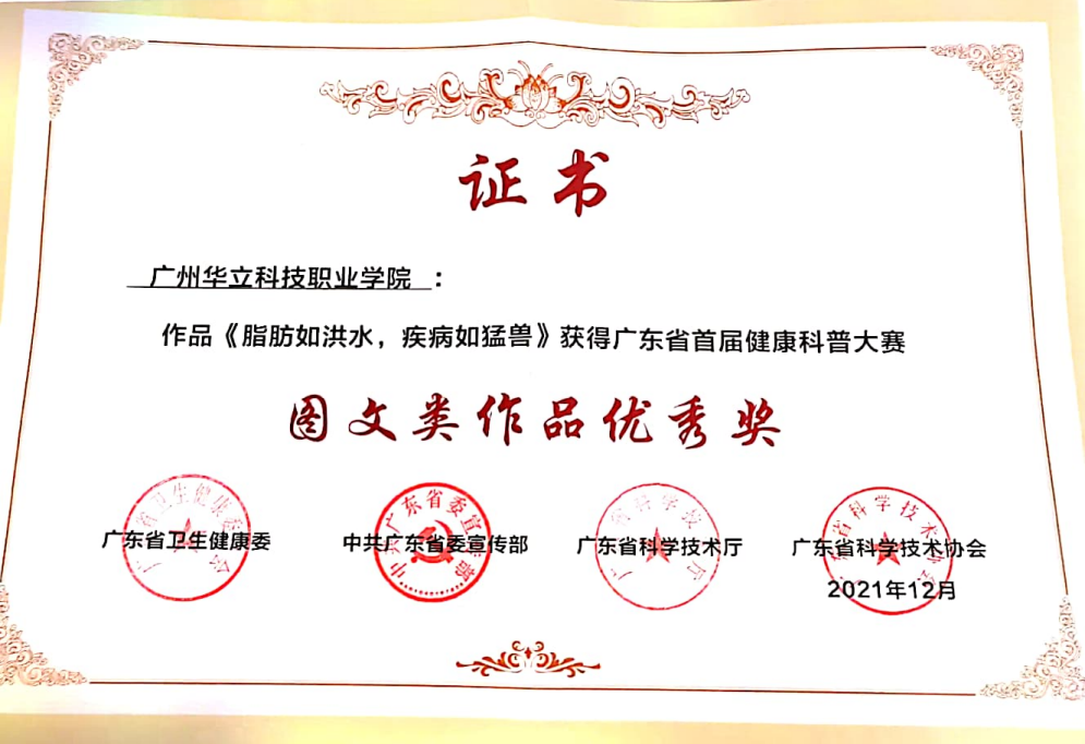 為進(jìn)一步貫徹落實(shí)《“健康中國”規(guī)劃綱要》,推進(jìn)健康中國、健康廣東行動(dòng),引導(dǎo)人民群眾提高自我防護(hù)和健康管理能力,廣州華立科技職業(yè)學(xué)院健康學(xué)院積極參加由廣東省衛(wèi)建委、廣東省委宣傳部、廣東省科學(xué)技術(shù)廳、廣東省科學(xué)技術(shù)協(xié)會(huì)主辦的廣東省首屆健康科普大賽。本次大賽收到衛(wèi)生健康、宣傳、科技、科協(xié)等部門以及學(xué)校、社會(huì)組織、相關(guān)單位及專業(yè)人員推薦的作品共計(jì)1729件。經(jīng)過各類別專家組和綜合大眾評(píng)審、復(fù)審,我院《夜的美》、《脂肪如洪水、疾病如猛獸》分別獲得圖文類作品二等獎(jiǎng)和優(yōu)秀獎(jiǎng)。