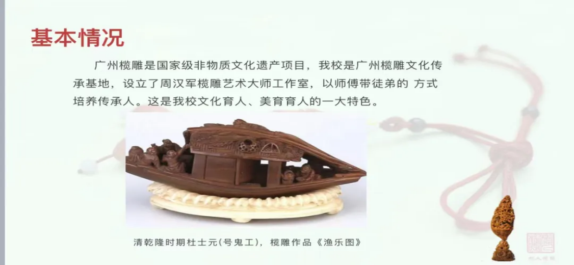 欖雕屬于傳統(tǒng)民間工藝,以改良技法和鑲嵌組合技藝,欖雕工藝又提升到了一個(gè)新的階段。制作一件優(yōu)秀的作品,需要雕刻者飽讀詩書、斟酌創(chuàng)意,作品是對作者自身文化修養(yǎng)、藝術(shù)修養(yǎng)和創(chuàng)造力的最佳體現(xiàn)。隨后評建辦主任李艷華還表示欖雕的技藝需要我們年青的一代去傳承,希望對欖雕有興趣的同學(xué)可以加入欖雕傳承人周漢軍先生的工作室觀賞、學(xué)習(xí)。