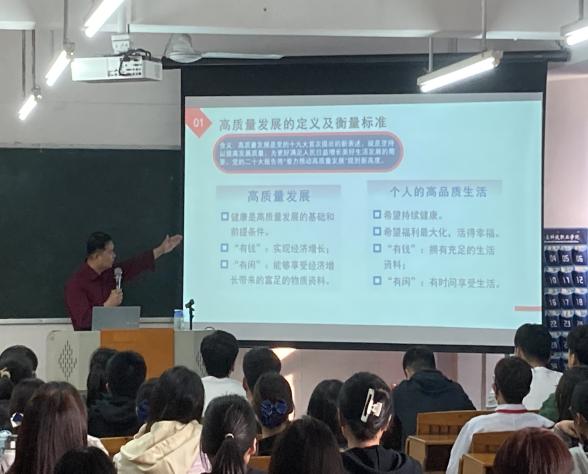 雷毅雄院長從黨和國家過去5年和新時代10年偉大變革中,結(jié)合自身感受,深入解讀了黨的二十大精神、高質(zhì)量發(fā)展的定義及衡量標(biāo)準(zhǔn),深刻闡述高質(zhì)量發(fā)展作為全面建設(shè)社會主義現(xiàn)代化國家首要任務(wù)的重大意義。隨后,針對如何實現(xiàn)高質(zhì)量發(fā)展,雷毅雄院長從從市場機(jī)制、財政政策、科技創(chuàng)新等方面詳細(xì)介紹了黨的二十大報告的相關(guān)內(nèi)容。最后,雷毅雄院長指出,作為大學(xué)生,推進(jìn)高質(zhì)量的發(fā)展就是如何提高自己的全面發(fā)展,并對同學(xué)們在提高自身全面發(fā)展上提出了幾點要求:一要樹立正確的人生觀;二要樹立正確的價值觀;三要堅持做好修身養(yǎng)性;四要積極重視身體鍛煉;五要堅持自力自強(qiáng)。雷院的諄諄話語,殷殷囑托,激發(fā)了同學(xué)們?yōu)槟繕?biāo)不懈奮斗的澎湃力量。