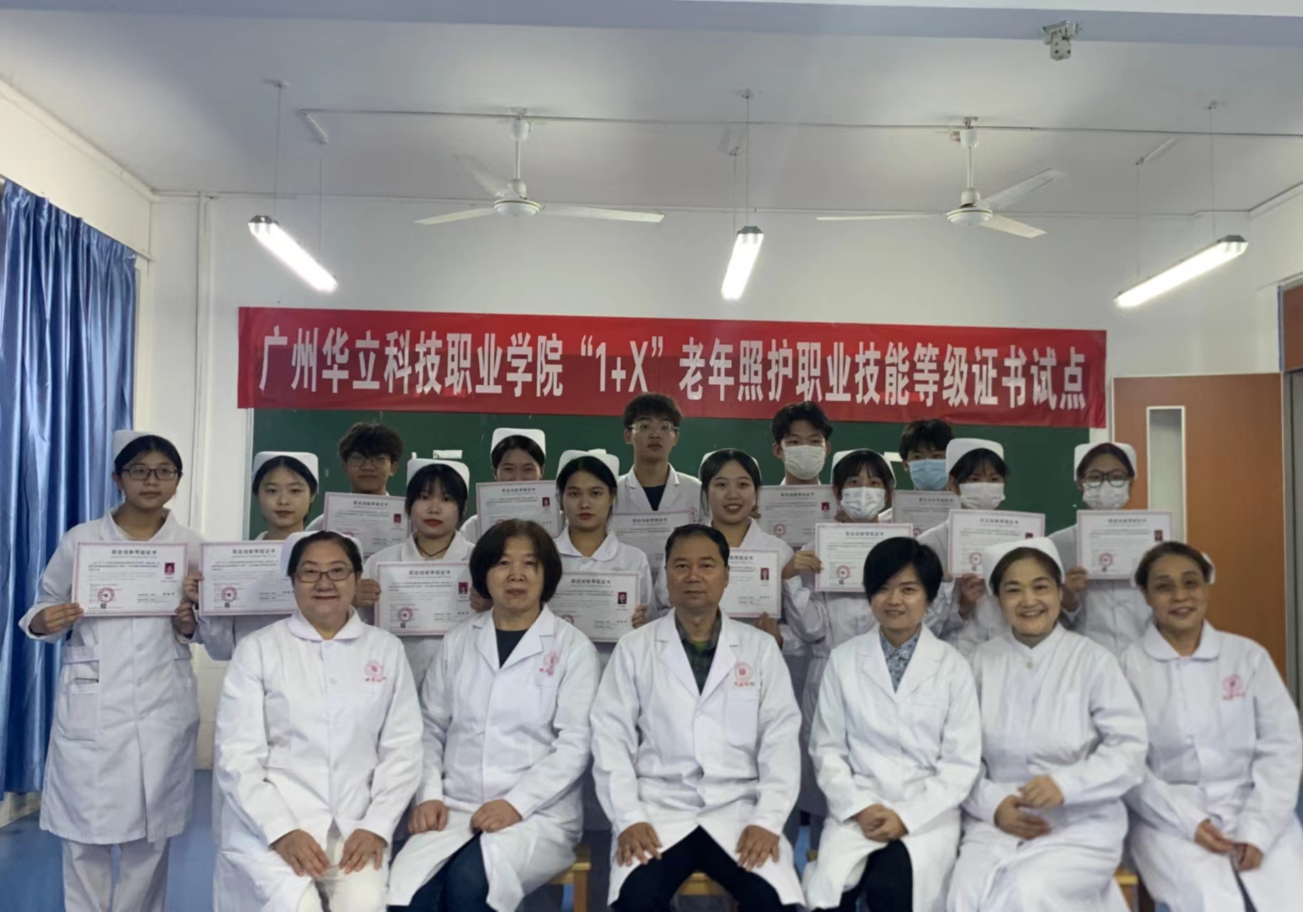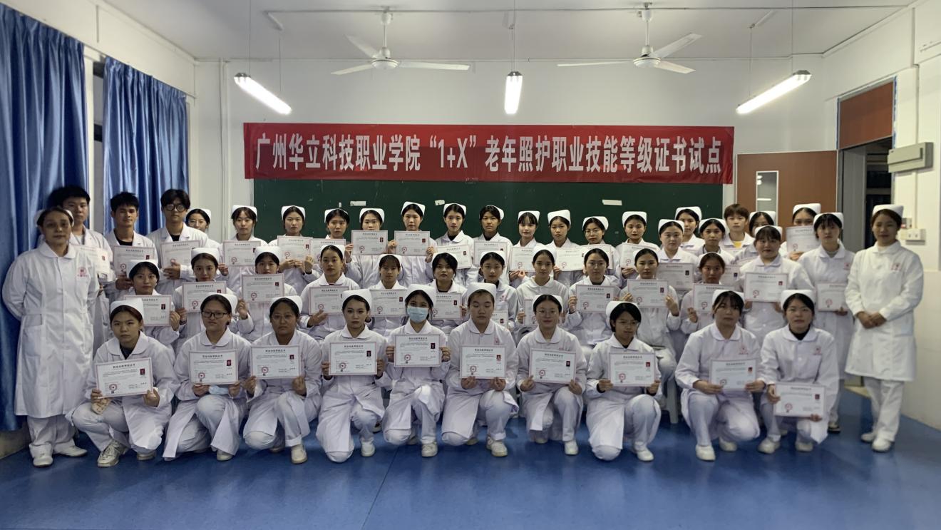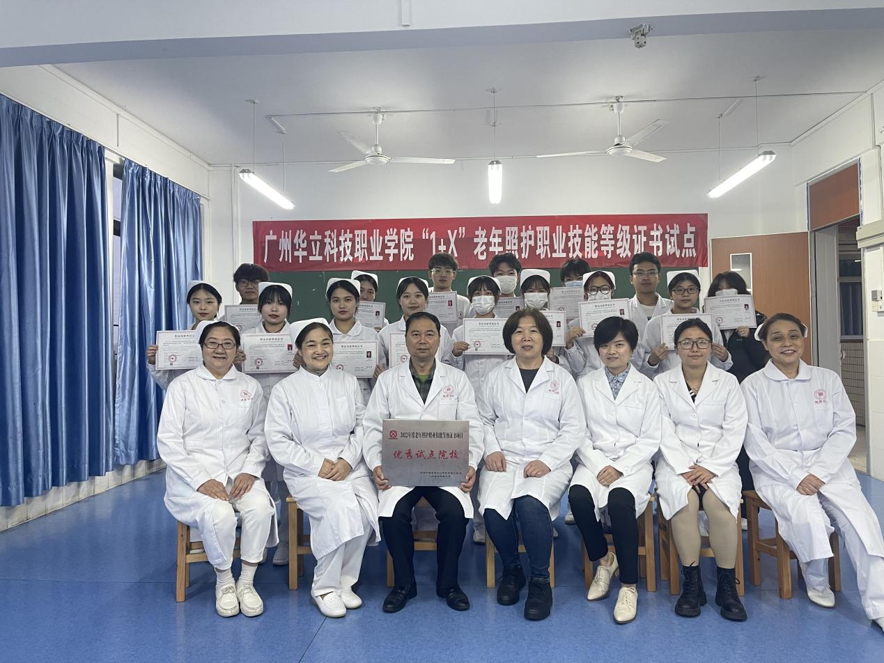廣州華立科技職業(yè)學(xué)院健康學(xué)院為貫徹落實國務(wù)院《國家職業(yè)教育改革實施方案》及教育部等四部委《關(guān)于在院校實施“學(xué)歷證書+若干職業(yè)技能等級證書”制度試點方案》等文件的要求,積極推進(jìn)“1+X”老年照護(hù)技能等級證書試點工作。我院在依托專業(yè)群(護(hù)理、健康管理、康復(fù)治療技術(shù))建設(shè)的基礎(chǔ)上,積極探索“書證融通”課程體系搭建,結(jié)合“崗課賽證”要求重構(gòu)教學(xué)內(nèi)容,大膽實施課堂改革,2022年在面對“疫情”等不利條件下,組織在校生183人參加考試,通過率達(dá)95%以上,高效且圓滿的完成了第一屆“老年照護(hù)職業(yè)技能(初級)等級證書”試點考證工作,鑒于在師資建設(shè)、課程改革與考證組織等方面的優(yōu)秀表現(xiàn),2023年3月,教育部“1+X”證書機(jī)構(gòu)北京中福長者文化科技有限公司經(jīng)考核后授予我校“優(yōu)秀試點院?!狈Q號,健康學(xué)院雷毅雄院長及相關(guān)老師出席授匾儀式,同時給通過考試的同學(xué)頒發(fā)證書。
