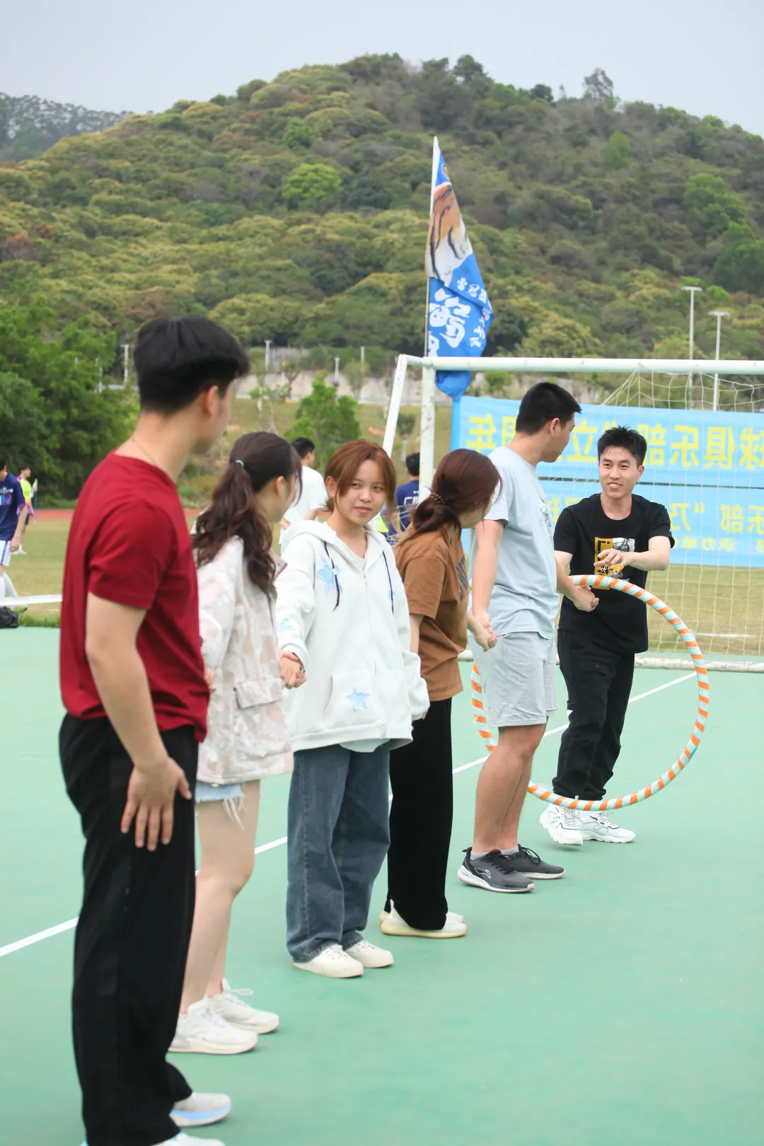 3.傳遞呼啦圈:脫離了傳統(tǒng)的個人腰部鍛煉,變成了集體之間的合作運(yùn)動,不僅提升了學(xué)生之間的協(xié)調(diào)能力,還提升了團(tuán)結(jié)合作氛圍。