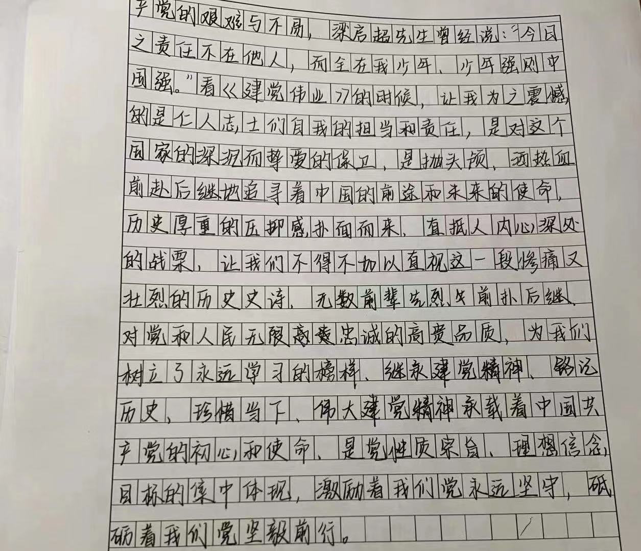 觀看完《建黨偉業(yè)》這部電影,同學(xué)們感受到了革命先輩在那段崢嶸歲月里的熱血與激情,感受到了對共產(chǎn)主義事業(yè)崇高的信仰和不懈的追求。同學(xué)們被這部電影深深觸動,寫下了自己的感想。來自22中醫(yī)4班的潘佳怡表示,無數(shù)前輩先烈前仆后繼,對黨和人民無限忠誠的高貴品質(zhì),為我們樹立了永遠學(xué)習(xí)的榜樣。我們要繼承建黨精神,牢記共產(chǎn)黨人的初心和使命,為人民、為國家、為民族貢獻屬于自己的力量?;茧y之中,方顯大愛,劇中情感細膩的情節(jié)讓人不禁潸然淚下。來自22中醫(yī)4班的謝己坤同學(xué)表示,在觀影中看到動情處情難自己,眼眶濡濕,如蔡鍔與小鳳仙在車站離別時的場景?!坝⑿蹥舛?,兒女情長”,并不是說英雄就必須斷絕兒女之情,而是面對民族存亡,對國家之大愛與兒女之小愛的取舍所體現(xiàn)的英雄之大愛情懷。