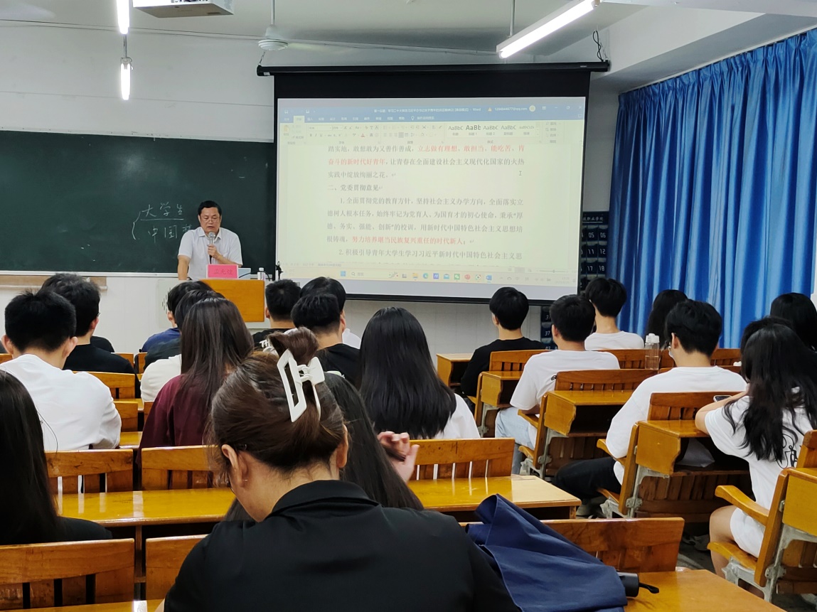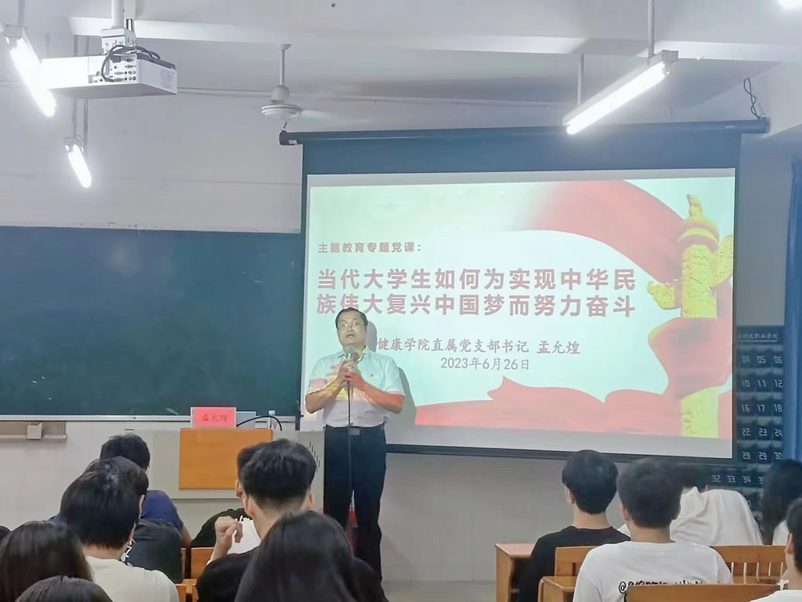 根據(jù)學(xué)校黨委關(guān)于深入開(kāi)展學(xué)習(xí)貫徹習(xí)近平新時(shí)代中國(guó)特色社主義思想主題教育專題黨課安排,2023年6月26日晚,健康學(xué)院直屬黨支部在西2-205教室,為健康學(xué)院22級(jí)學(xué)生干部代表和黨建小組成員組織一堂別開(kāi)生面的專題黨課。黨支部書(shū)記孟允煌以《當(dāng)代大學(xué)生如何為實(shí)現(xiàn)中華民族偉大復(fù)興中國(guó)夢(mèng)而努力奮斗》為主題,鼓勵(lì)同學(xué)們刻苦學(xué)習(xí)、勇于實(shí)踐、艱苦奮斗、與時(shí)俱進(jìn)、開(kāi)拓創(chuàng)新,用自己勤勞的雙手收獲成功、托起自己的夢(mèng)、托起中國(guó)夢(mèng)。