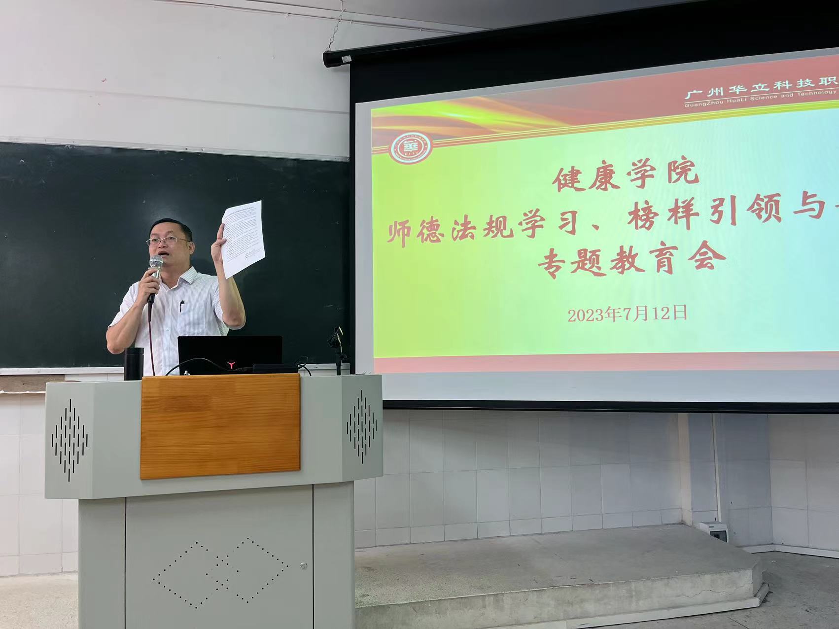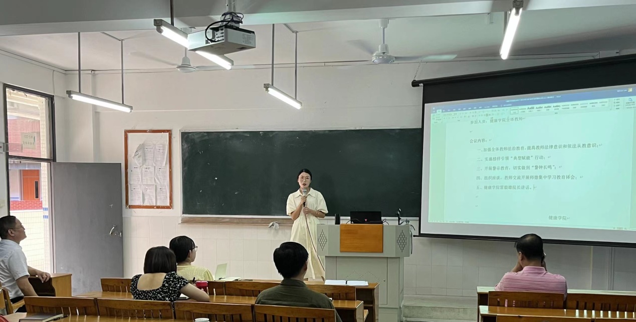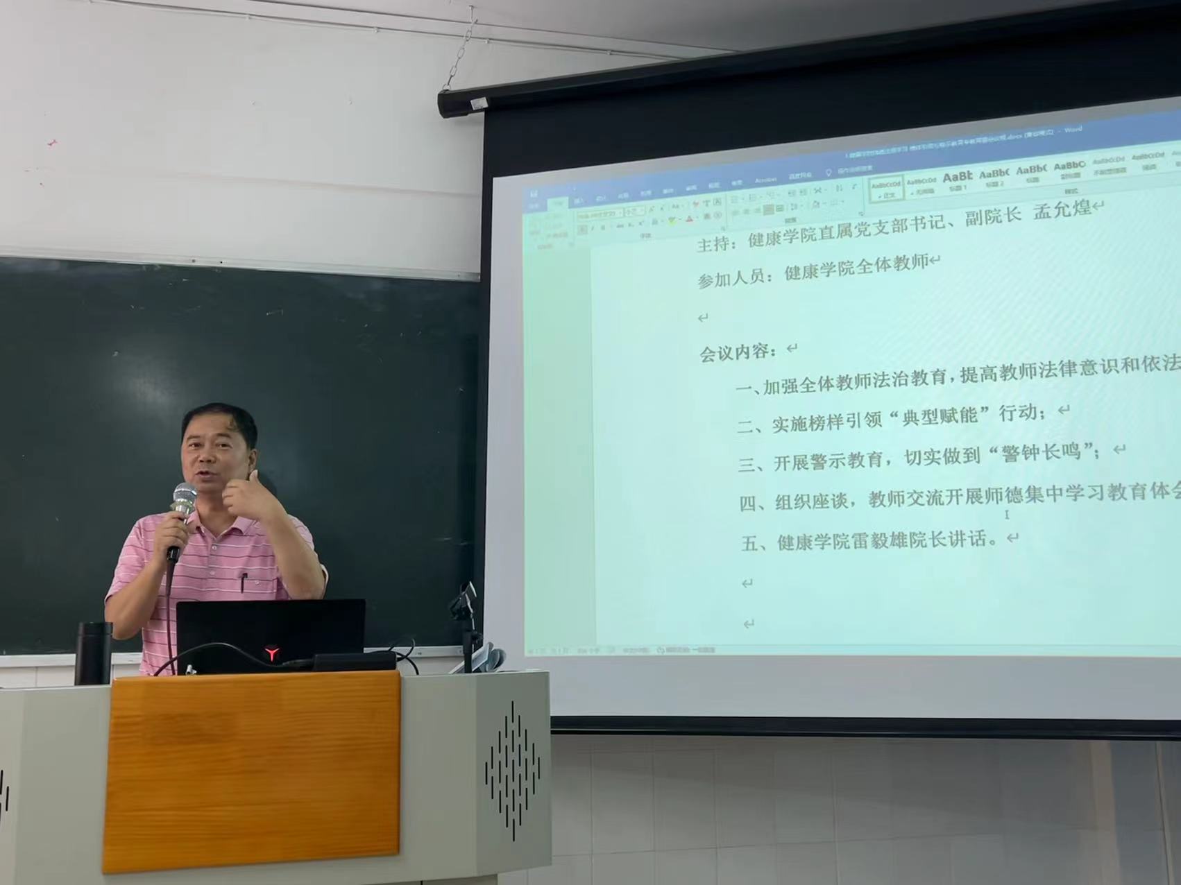 在組織學院全體教師舉行師德集中學習教育動員會后,為進一步把德師風建設引向深入,2023年7月12日下午,健康學院再次組織學院全體教師在西2-201會議室舉行師德法規(guī)學習、榜樣引領與警示教育專題教育會。會議由學院直屬黨支部書記、副院長孟允煌主持,院長雷毅雄對本次師德集中學習教育作總結發(fā)言。