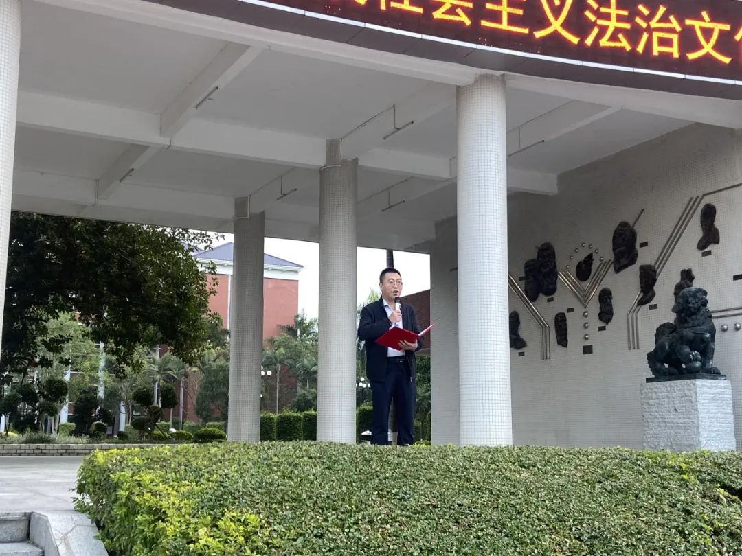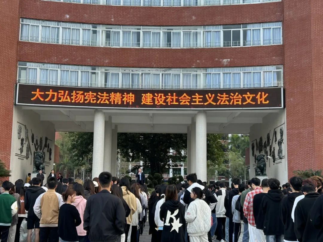 隨風(fēng)飄揚(yáng)的國旗,暖暖灑下的陽光,廣州華立科技職業(yè)學(xué)院黨委副書記高堯來副校長向老師同學(xué)們普及憲法知識(shí),12月4日是國家憲法日,希望大家記住這一天,認(rèn)真學(xué)習(xí)憲法的一些知識(shí)。權(quán)力屬于人民,權(quán)力屬于憲法,一切違反憲法和法律的行為都必須予以追究和糾正,我們也要引以為戒,不做違法亂紀(jì)的事。希望全體師生提高認(rèn)識(shí),積極了解憲法,弘揚(yáng)憲法精神,成為對社會(huì)責(zé)任,有擔(dān)當(dāng)?shù)氖胤ü?,同時(shí)我們大家要深入學(xué)習(xí)習(xí)近平總書記的法治思想,用法律鑄就屏障,不斷將理論和實(shí)踐結(jié)合,取得新成果,為推動(dòng)全面依法治國貢獻(xiàn)力量,書寫法治中國新篇章!