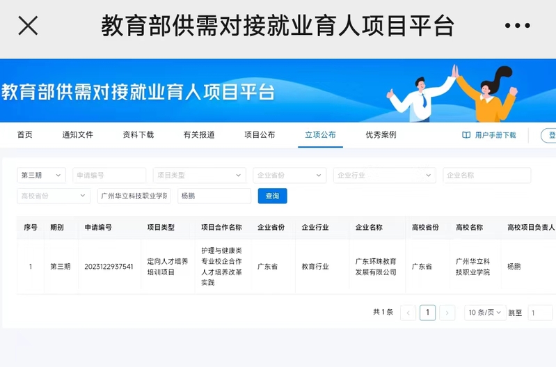 2024年6月,廣州華立科技職業(yè)學(xué)院健康學(xué)院楊鵬老師申報(bào)的定向人才培養(yǎng)培訓(xùn)項(xiàng)目《護(hù)理與健康類(lèi)專(zhuān)業(yè)校企合作人才培養(yǎng)改革實(shí)踐》獲得立項(xiàng)成功。2023年12月,廣東環(huán)珠教育發(fā)展有限公司創(chuàng)新申報(bào)的“專(zhuān)本碩博銜接貫通”人才培養(yǎng)改革課題獲得教育部核準(zhǔn)發(fā)布,并設(shè)立定向人才培養(yǎng)培訓(xùn)、就業(yè)實(shí)習(xí)基地、人力資源提升、重點(diǎn)領(lǐng)域校企合作、重點(diǎn)群體就業(yè)幫扶等五大類(lèi)別供需對(duì)接就業(yè)育人項(xiàng)目若干項(xiàng)。