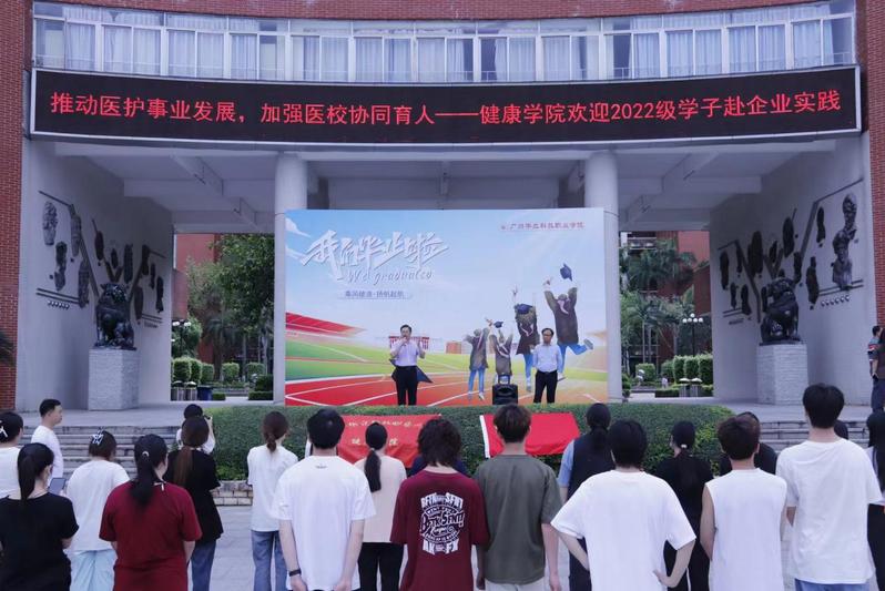 鳳凰花開,驪歌蕩漾。2024年7月2號上午九點,健康學院2022級護理專業(yè)實習生歡送會在綜合樓廣場舉辦。健康學院院長雷毅雄、健康學院黨支部書記孟允煌院長、溫偉勝副院長、學生管理辦公室主任劉偉鑫主任、相關(guān)指導(dǎo)老師及22級護理專業(yè)去往韶關(guān)人民醫(yī)院、韶關(guān)中醫(yī)藥、茂名石化醫(yī)院實習的同學參加了此次歡送會。