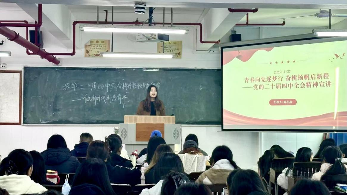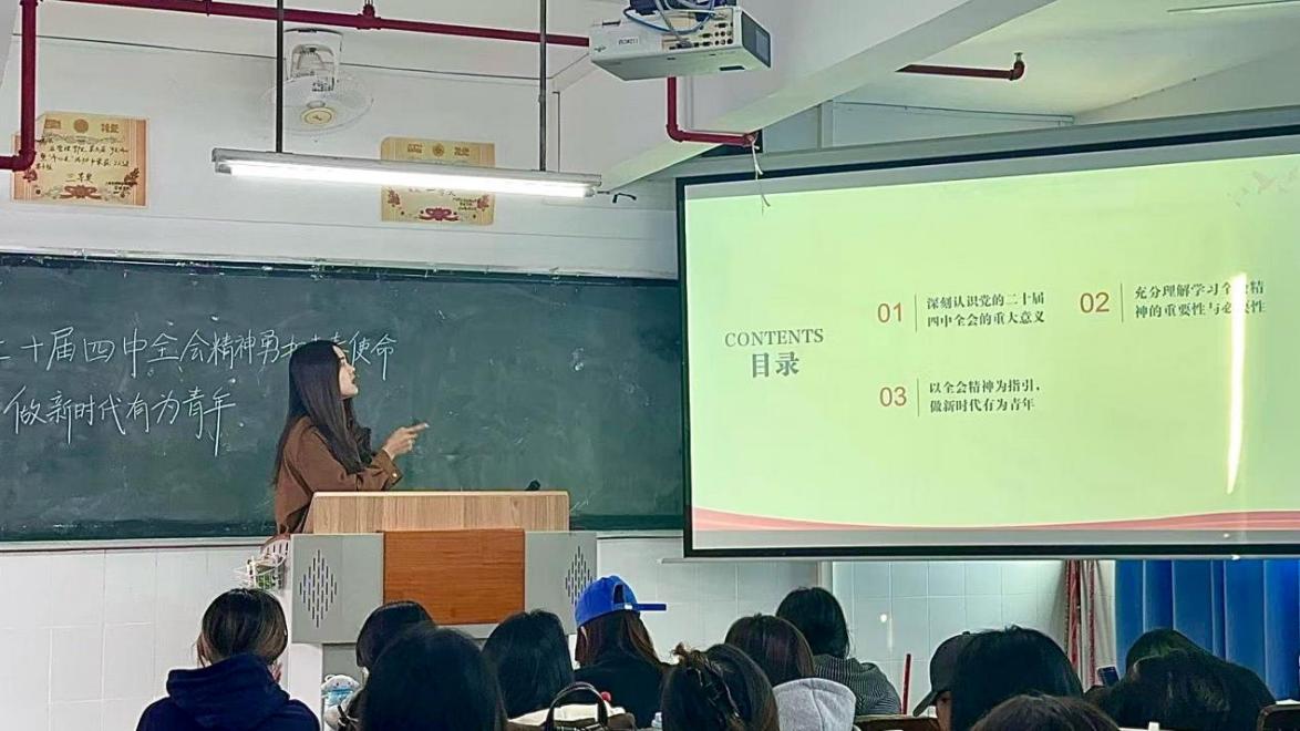 陳老師生動(dòng)闡釋道:“黨的二十屆四中全會(huì)為國家發(fā)展擘畫了宏偉藍(lán)圖,更與我們每位青年學(xué)子的成長成才緊密相連。”她著重強(qiáng)調(diào),2025年是“十四五“ 收官與“十五五”謀劃的關(guān)鍵之年,深入學(xué)習(xí)全會(huì)精神,是青年學(xué)子認(rèn)清時(shí)代方位、找準(zhǔn)人生航向的 “必修課”,能幫助大家在專業(yè)學(xué)習(xí)與人生規(guī)劃中明確方向、積蓄?yuàn)^進(jìn)力量。