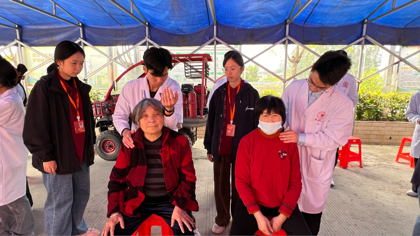 服務(wù)過(guò)程中,學(xué)生志愿者們始終恪守“不診斷、不開方”的專業(yè)原則,遇到疑問(wèn)及時(shí)向帶隊(duì)老師請(qǐng)教,確保每一項(xiàng)服務(wù)都安全規(guī)范。秩序接待組的同學(xué)耐心安撫等候的老人,主動(dòng)幫忙搬椅子、遞溫水;宣傳記錄組的同學(xué)拿著相機(jī)穿梭現(xiàn)場(chǎng),定格下師生協(xié)作服務(wù)、村民笑容滿面的暖心瞬間;后勤保障組的同學(xué)則時(shí)刻關(guān)注物資補(bǔ)給,保持場(chǎng)地整潔,讓整個(gè)義診活動(dòng)高效又溫馨。