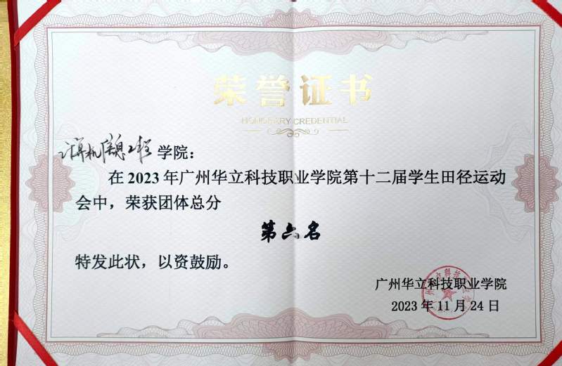 廣州華立科技職業(yè)學(xué)院第十二屆學(xué)生田徑運(yùn)動(dòng)會(huì)團(tuán)體總分第六名