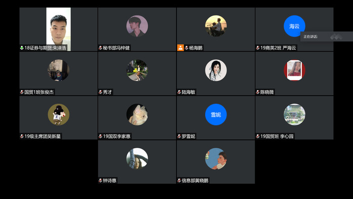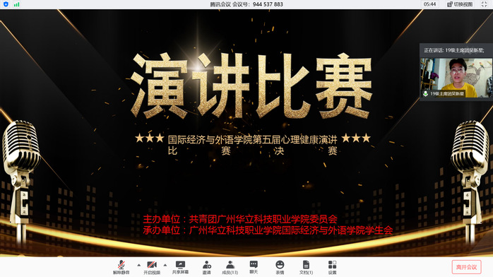 2020年6月13日晚上七點(diǎn)三十分,國貿(mào)學(xué)院在線上舉行第五屆心理健康演講比賽決賽。出席本次活動(dòng)的嘉賓有國貿(mào)學(xué)院學(xué)管主任劉偉鑫老師、國貿(mào)學(xué)院19級(jí)輔導(dǎo)員趙彩秀老師、陳曉薇老師以及團(tuán)總支學(xué)生會(huì)主席團(tuán)的師兄師姐們。本次演講比賽由國貿(mào)學(xué)院19級(jí)學(xué)生會(huì)主席團(tuán)成員吳新星主講。