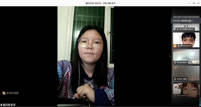首先,由管理學院團總支書記陳媛老師講話,她說到:對脫穎而出進入決賽的10位同學表示祝賀,線上演講給予同學們一個自我展示的機會,同時也能讓同學們在繁重的網課學習期間里帶來一些豐富多彩的活動,同時預祝同學們在比賽中取得優(yōu)異的成績。