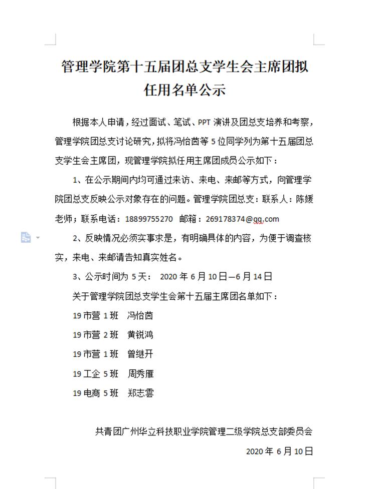 團總支學生會是學校聯(lián)系學生的橋梁和紐帶,是學校管理的助手和主力軍,團總支學生會工作的發(fā)展是學生們共同的希望。廣州華立科技職業(yè)學院管理學院團總支學生會第十五屆主席團第四輪競選于2020年6月9日晚上7點30分通過騰訊視頻會議線上舉行。