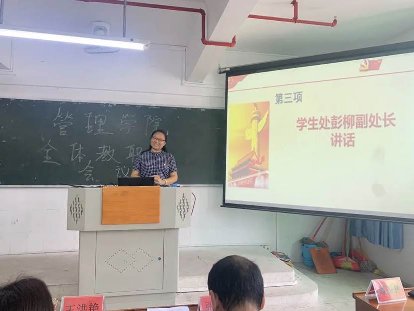 會議第三項,學生處彭柳副處長發(fā)表講話,她先是表達了對管理學院的不舍和感恩,然后又對一起共事的管院同志們致以感謝,同時也希望管理學院在新領導的引領下更進一步,將管院黨建隊伍發(fā)揚光大。