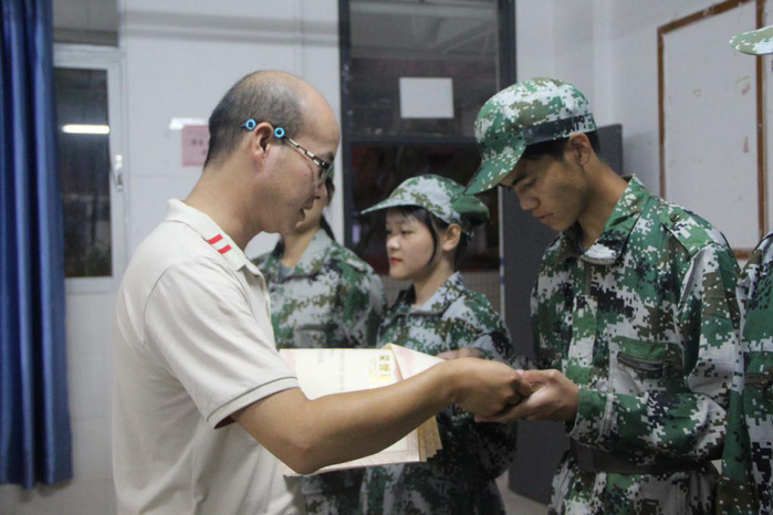 國貿學院20級輔導員廖后發(fā)老師為獲得優(yōu)秀軍訓生頒發(fā)榮譽證書