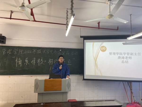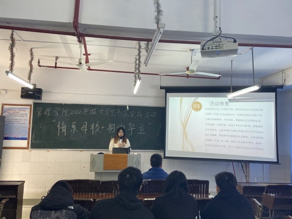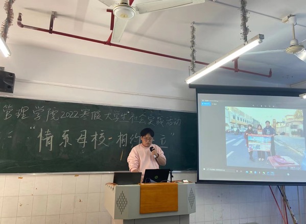 緊接著,管理學(xué)院學(xué)生會(huì)第一學(xué)期執(zhí)行主席施奕波同學(xué)為參與寒假社會(huì)實(shí)踐活動(dòng)的同學(xué)們簡(jiǎn)單介紹了去年回訪母校的經(jīng)歷和一些經(jīng)驗(yàn)。