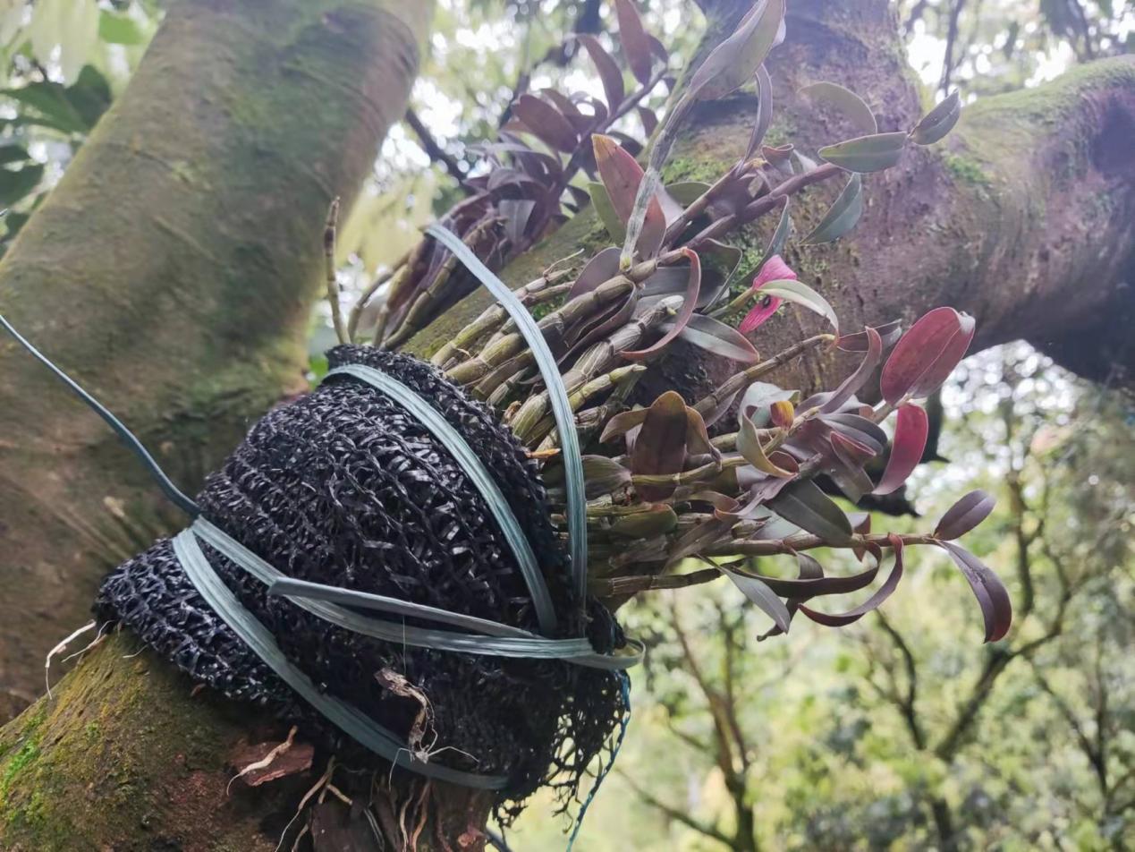 在參觀學(xué)習(xí)之后,我院師生扛著大箱鐵皮石斛苗,提著小袋工具材料,踏上了“荔枝樹上種石斛”之路。連日的陰雨使荔枝樹干充分濕潤(rùn),這有利于鐵皮石斛的生長(zhǎng),但也會(huì)讓山路泥濘林下濕滑,而這些困難阻擋不了師生黨員們澎湃的激情。