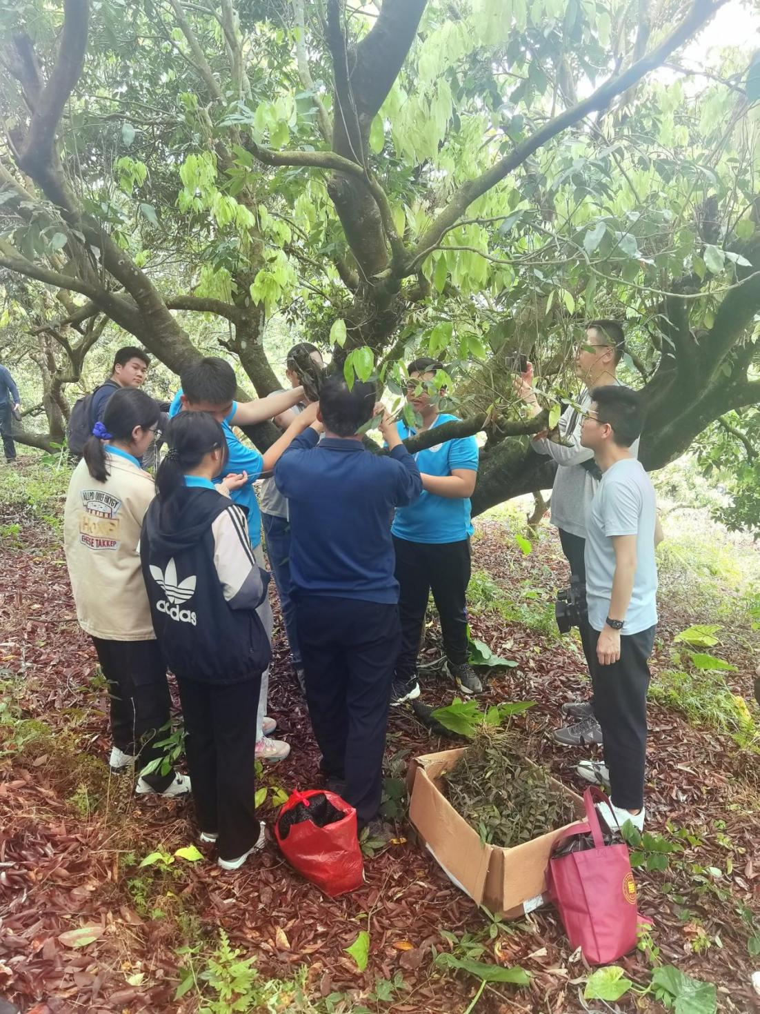 在參觀學(xué)習(xí)之后,我院師生扛著大箱鐵皮石斛苗,提著小袋工具材料,踏上了“荔枝樹上種石斛”之路。連日的陰雨使荔枝樹干充分濕潤,這有利于鐵皮石斛的生長(zhǎng),但也會(huì)讓山路泥濘林下濕滑,而這些困難阻擋不了師生黨員們澎湃的激情。