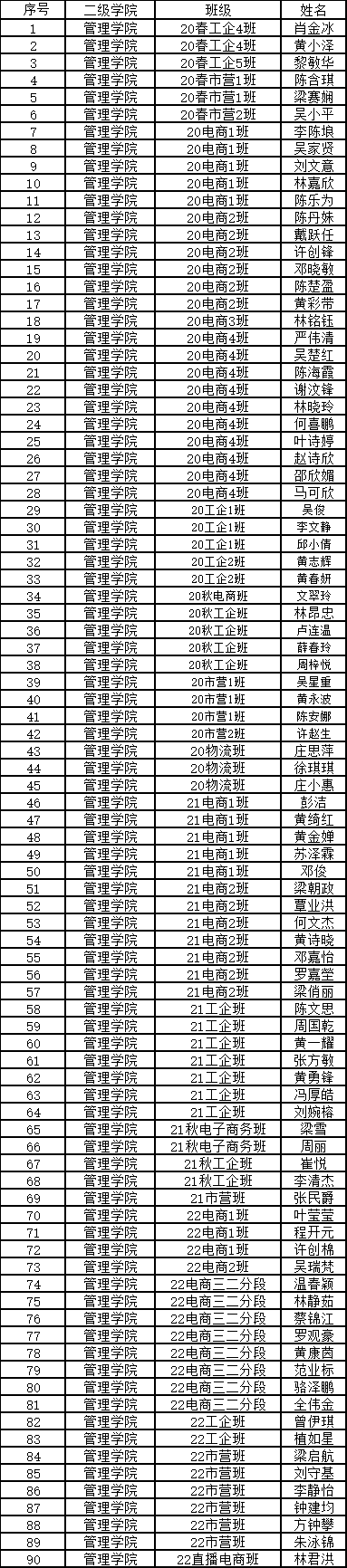 根據(jù)《廣東省教育廳關(guān)于做好2022年秋季學(xué)期學(xué)生資助工作的通知》和《廣州華立科技職業(yè)學(xué)院國家獎(jiǎng)助學(xué)金實(shí)施辦法(修訂)》、《廣州華立科技職業(yè)學(xué)院家庭經(jīng)濟(jì)困難學(xué)生認(rèn)定辦法(修訂)》等文件要求,經(jīng)學(xué)生本人申請(qǐng),管理學(xué)院領(lǐng)導(dǎo)小組進(jìn)行審核,現(xiàn)將學(xué)院初審認(rèn)定困難學(xué)生名單給予公示。如有異議者,請(qǐng)于公示期內(nèi)前將情況反饋到管理學(xué)院學(xué)管辦公室(西一505A)。