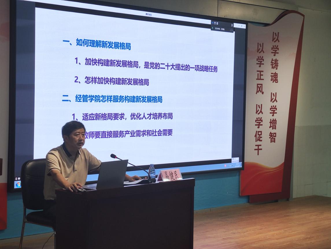 為推動學習貫徹習近平新時代中國特色社會主義思想主題教育走深走實,2023年6月7日下午,校長易健民教授、博士應邀到經濟管理學院開講專題黨課。易校長將自己研讀習近平總書記在《求是》雜志2023年第8期發(fā)表的文章和4月中旬視察廣東的重要講話、重要指示精神后的所思所感,結合當前國內外宏觀經濟形勢分析,為經濟管理學院師生黨員代表上了一堂立意深遠、思想深刻的專題黨課。學校科研處處長溫偉勝、產教融合辦主任劉宇赤,經管學院院長程玉賢、黨總支書記朱少先、副院長劉軍根以及兩校區(qū)教師黨員和學生代表(校區(qū)間視頻連線)共100多人參加了此次專題黨課學習。