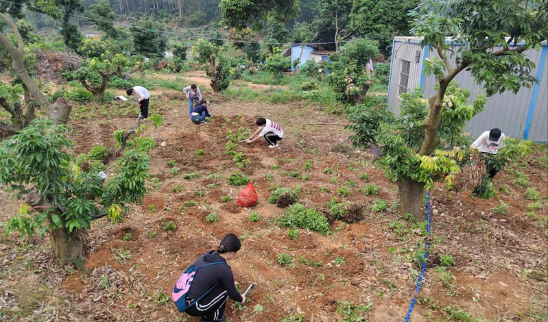 圖6 師生代表在荔枝林下為涼粉草拔草中