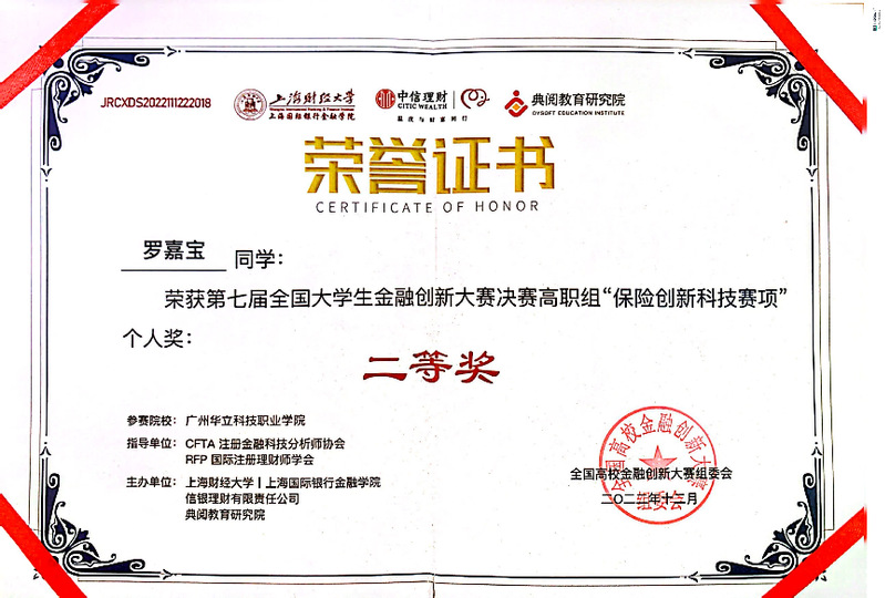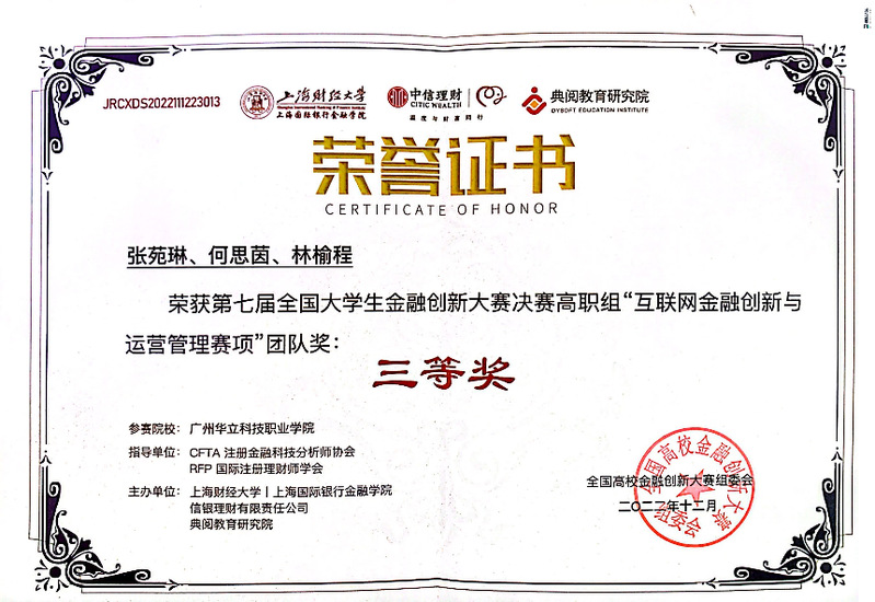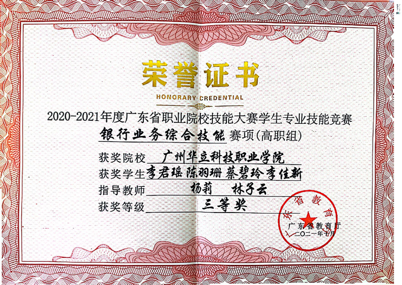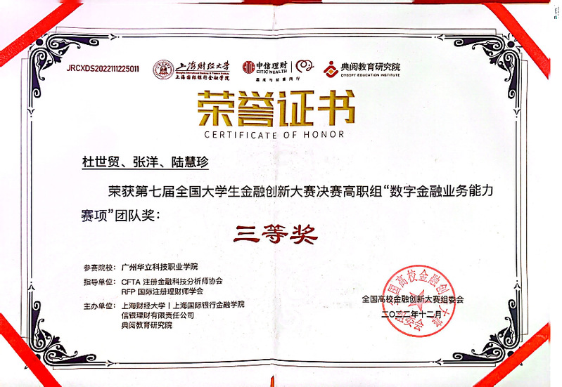 本專業(yè)鼓勵(lì)學(xué)生參加各級各類專業(yè)技能競賽,通過競賽提高專業(yè)技能,培養(yǎng)專業(yè)素養(yǎng)和職業(yè)道德。近三年,本專業(yè)學(xué)生先后榮獲全國金融與證券投資模擬實(shí)訓(xùn)大賽二等獎(jiǎng)、第六屆全國金融創(chuàng)新大賽互聯(lián)網(wǎng)金融賽項(xiàng)二等獎(jiǎng)和三等獎(jiǎng)、第六屆全國金融創(chuàng)新大賽數(shù)字金融賽項(xiàng)個(gè)人獎(jiǎng)三等獎(jiǎng)、廣東省高等學(xué)校職業(yè)技能競賽-銀行業(yè)務(wù)綜合技能三等獎(jiǎng)等。