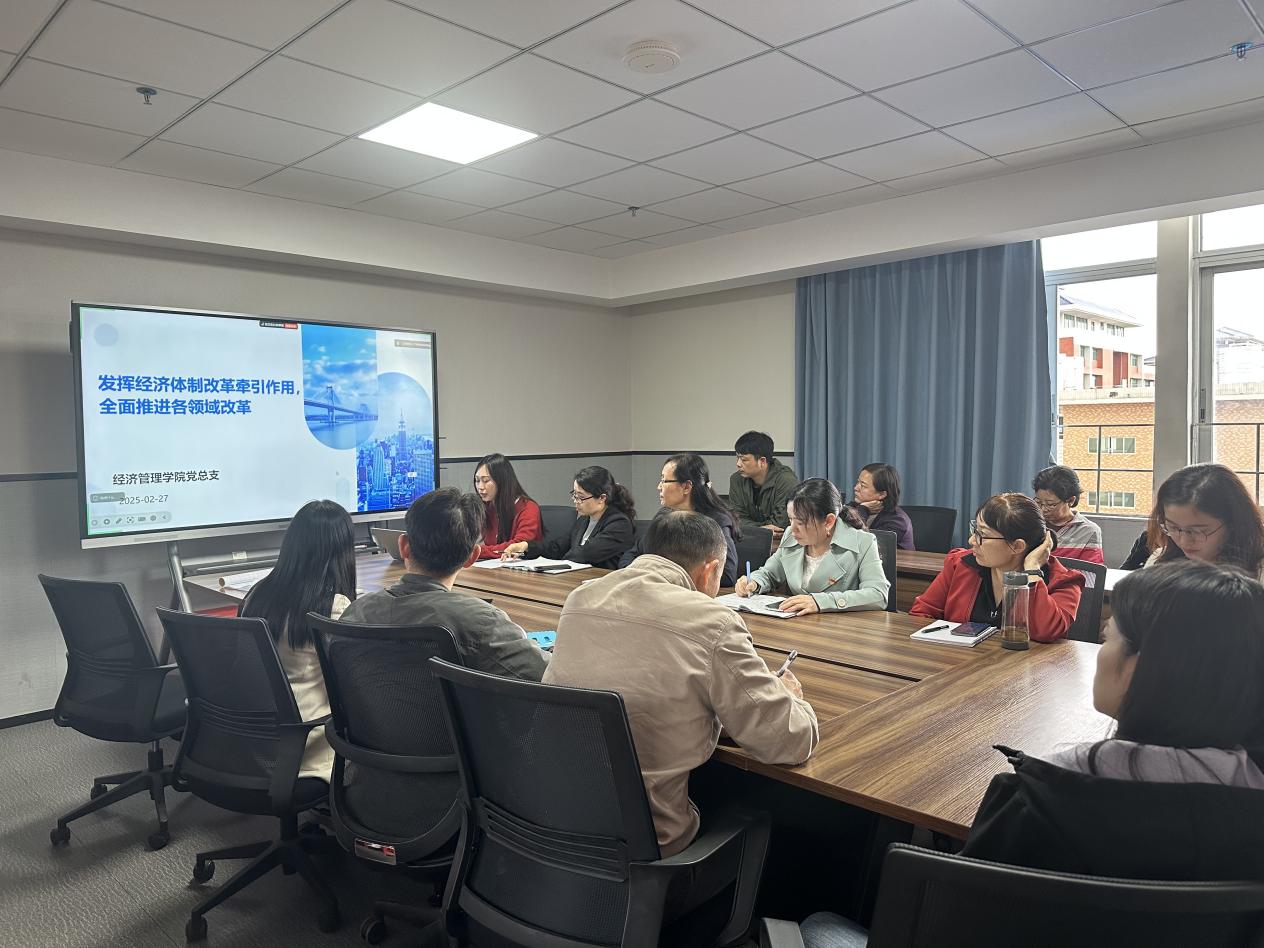 2025年2月27日,經(jīng)濟管理學院黨總支在廣州校區(qū)黨員活動室召開“學習貫徹黨的二十屆三中全會精神”專題學習會,圍繞“發(fā)揮經(jīng)濟體制改革牽引作用,全面推進各領(lǐng)域改革”主題展開深入研討。會議由黨總支副書記謝曉慧同志主持,經(jīng)濟管理學院黨總支書記劉惠玲同志及廣州校區(qū)全體黨員出席,云浮校區(qū)黨支部全體黨員線上參會。