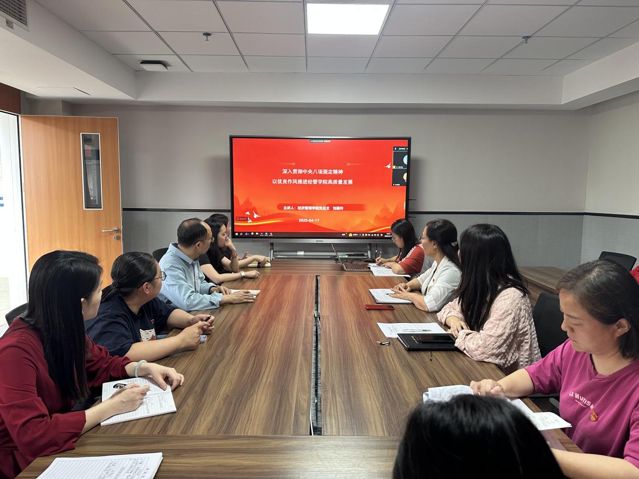 為持續(xù)深化中央八項規(guī)定精神貫徹落實,2025年4月17日,經(jīng)濟管理學(xué)院黨總支書記劉惠玲同志在西一613開展題為《深入貫徹中央八項規(guī)定精神 以優(yōu)良作風(fēng)推進經(jīng)管學(xué)院高質(zhì)量發(fā)展》的學(xué)習(xí)教育專題黨課,學(xué)院全體教師黨員參加此次學(xué)習(xí)。