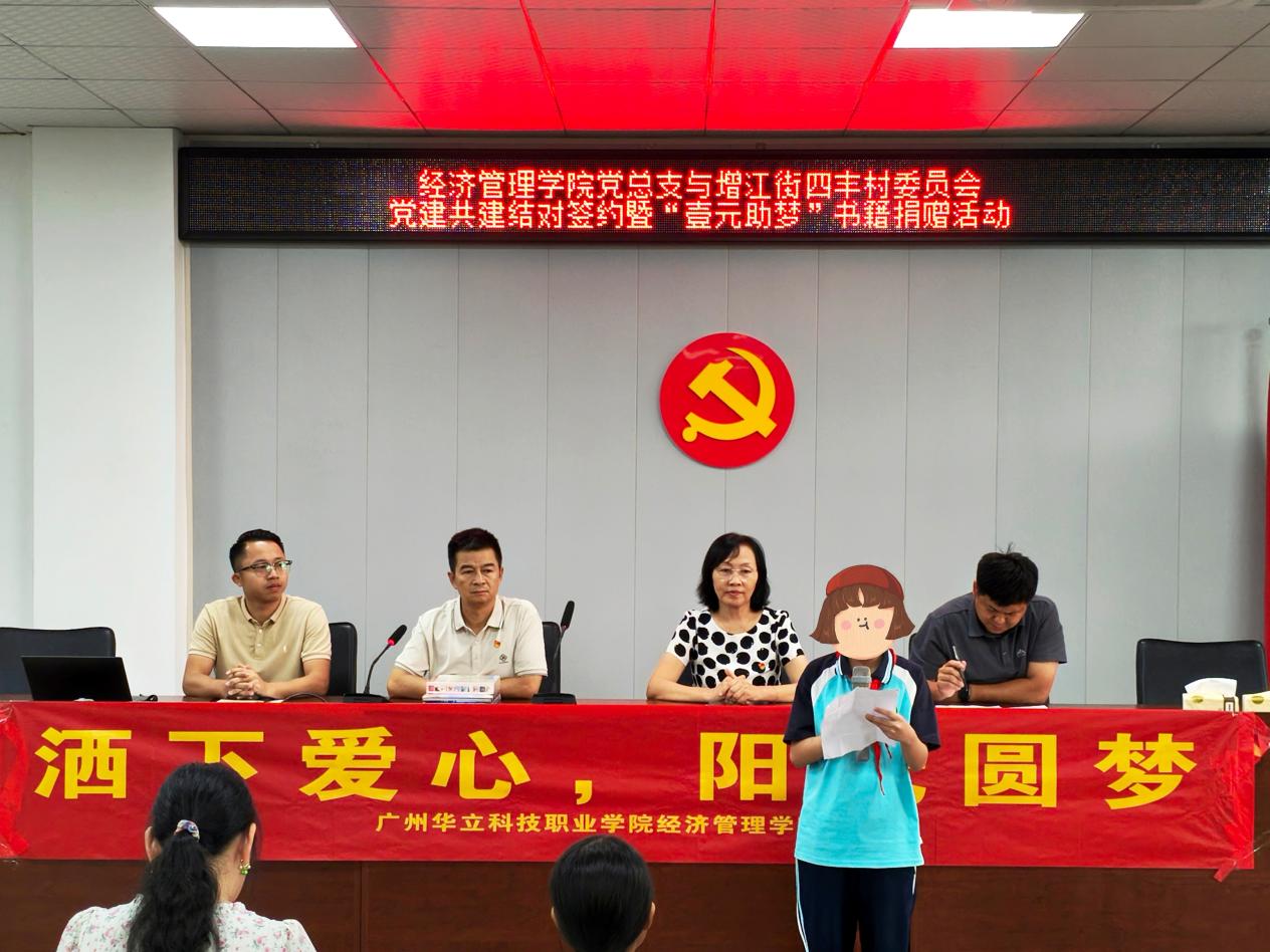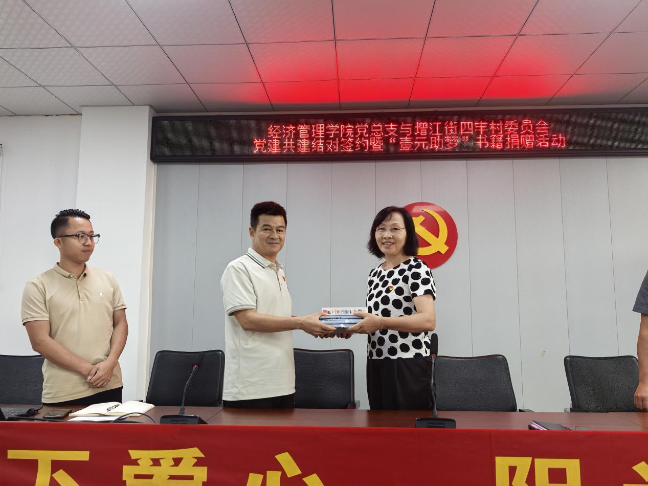 為弘揚奉獻精神,傳遞知識力量,助力夢想起航,6月30日,經(jīng)濟管理學院黨總支在四豐村黨群服務中心開展“壹元助夢”愛心書籍捐贈活動。經(jīng)濟管理學院黨總支書記、院長劉惠玲,副院長朱向平,四豐村黨支部書記陳耀堅、四豐小學校長陳遠球及村民代表、師生代表共同出席了活動。
