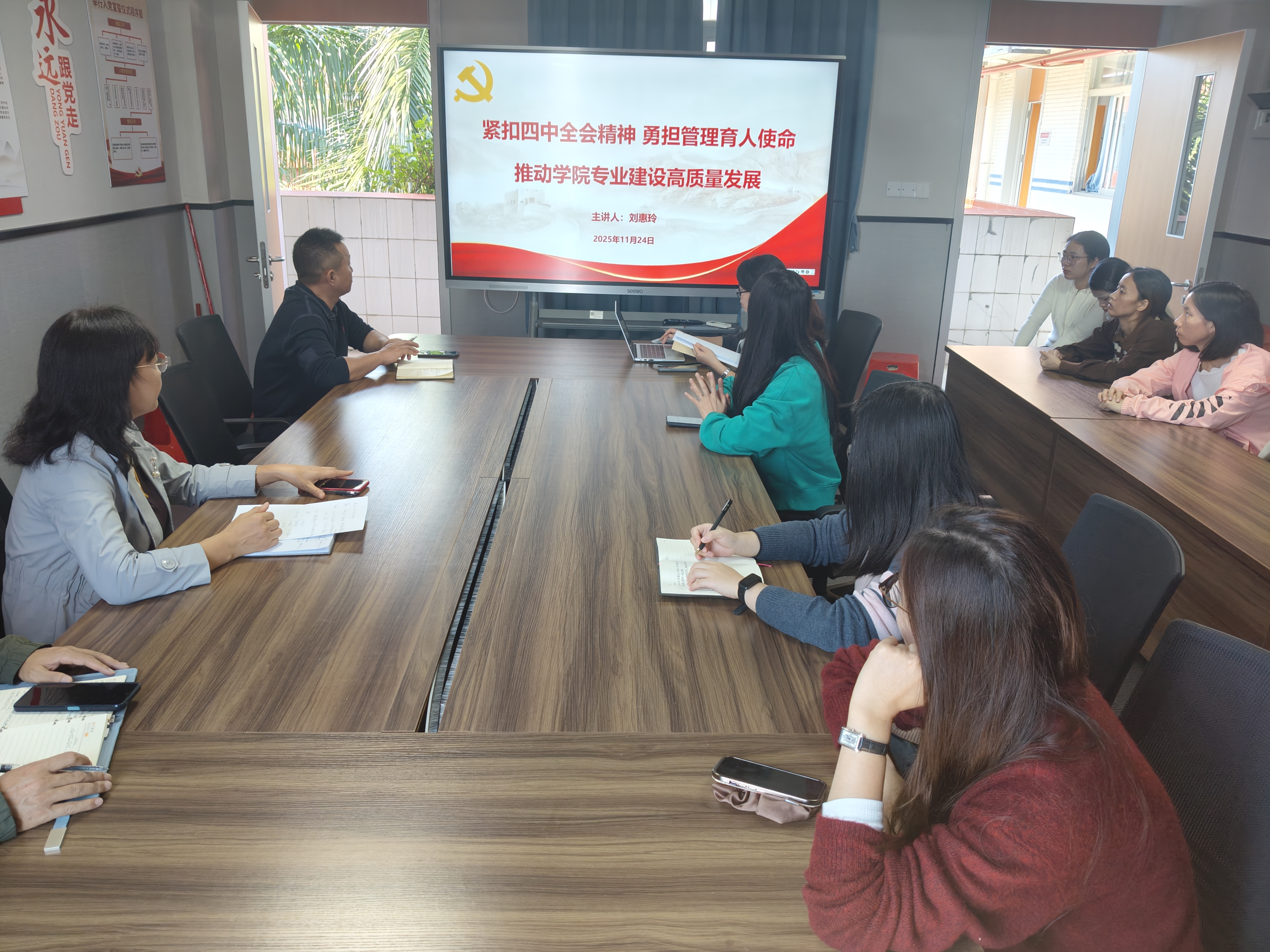 會(huì)上,黨總支書記劉惠玲同志圍繞“緊扣四中全會(huì)精神 勇?lián)芾碛耸姑敝黝},強(qiáng)調(diào)全會(huì)擘畫了“十五五”時(shí)期現(xiàn)代化建設(shè)藍(lán)圖,學(xué)院需以服務(wù)國(guó)家戰(zhàn)略為導(dǎo)向,優(yōu)化專業(yè)布局,動(dòng)態(tài)調(diào)整數(shù)字經(jīng)濟(jì)、綠色經(jīng)濟(jì)等領(lǐng)域課程體系,深化產(chǎn)教融合,推動(dòng)“崗課賽證”融通,通過(guò)校企共建實(shí)訓(xùn)基地提升學(xué)生實(shí)踐能力。同時(shí),依托數(shù)字技術(shù)構(gòu)建智慧課堂,強(qiáng)化師資隊(duì)伍建設(shè),完善質(zhì)量保障機(jī)制,激發(fā)師生干事創(chuàng)業(yè)熱情。