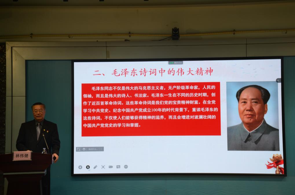 林偉健書記以《弘揚(yáng)紅色精神 煥發(fā)青春熱情—從毛澤東詩詞中學(xué)中共黨史》為題,重點(diǎn)圍繞“偉大建黨精神構(gòu)建起了中國(guó)共產(chǎn)黨人的精神譜系”、“毛澤東詩詞中的偉大精神”、“偉人的風(fēng)采和情懷,激勵(lì)著我們奮進(jìn)新時(shí)代”三個(gè)方面展開,通過對(duì)毛主席詩詞的解讀和賞析,讓大家從毛主席詩詞的創(chuàng)作背景、詩歌內(nèi)容、思想內(nèi)涵等方面,一起重溫黨的光輝歷史和豐功偉績(jī),領(lǐng)略共產(chǎn)黨人的理想信念和初心使命,體悟先賢們深厚的愛國(guó)情懷和勇敢的責(zé)任擔(dān)當(dāng)。林書記以平實(shí)親切的語言,鏗鏘有力的語調(diào),向同學(xué)們娓娓道來中國(guó)共產(chǎn)黨一路走來篳路藍(lán)縷的艱辛歷程,引導(dǎo)從紅色詩詞中感悟中國(guó)共產(chǎn)黨的百年奮斗歷程,深入領(lǐng)會(huì)中國(guó)共產(chǎn)黨人的革命精神與革命斗志,讓紅色詩詞激蕩心靈,堅(jiān)定新時(shí)代青年學(xué)生的理想信念,樹立遠(yuǎn)大理想;厚植愛國(guó)情懷,筑牢信仰之基。