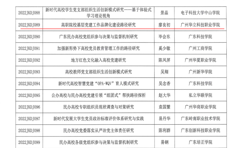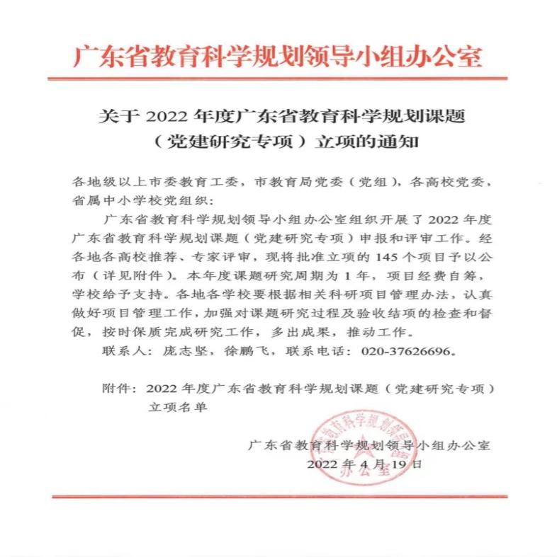 近日,廣東省教育科學(xué)規(guī)劃領(lǐng)導(dǎo)小組辦公室發(fā)布了《關(guān)于2022年度廣東省教育科學(xué)規(guī)劃課題(黨建研究專項)立項的通知》,經(jīng)過專家評審、公示和省教育科學(xué)規(guī)劃小組審定等程序,公布了廣東省2022年度課題立項情況,我校馬克思主義學(xué)院廖良初教授、梁國英副教授申報的課題《高職院校基層黨建工作品牌化建設(shè)路徑研究》獲得立項。項目批準(zhǔn)號為2022JKDJ089。
