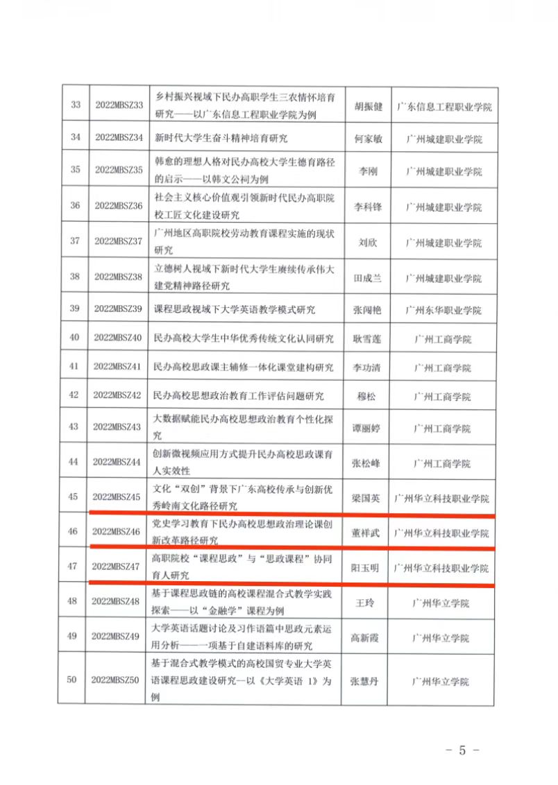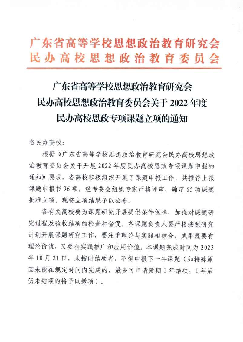 近日,廣東省高等學(xué)校思想政治教育研究會民辦高校思想政治教育委員會發(fā)布了關(guān)于2022年度民辦高校思政專項課題立項的通知,經(jīng)各高校積極組織申報,共推薦上報課題申報書96項。由各專委會組織專家嚴格評審,確定65項課題批準立項。我校馬克思主義學(xué)院梁國英老師、董祥武老師、陽玉明老師申報的課題獲得立項,項目批準號分別為2022MBSZ45、2022MBSZ46、2022MBSZ47。