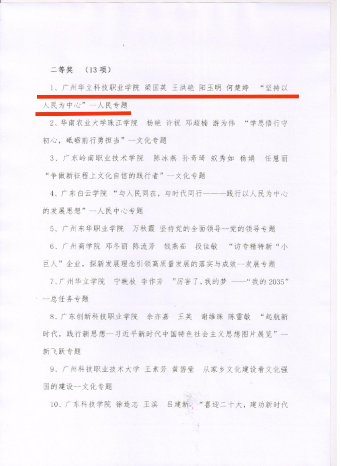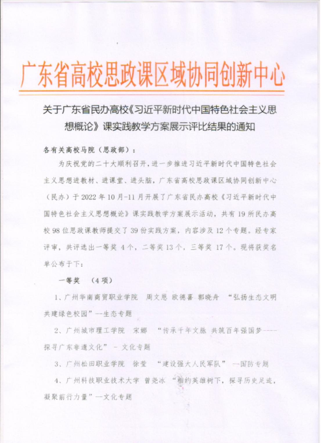 為了進一步推進習(xí)近平新時代中國特色社會主義思想進教材、進課堂、進頭腦,廣東省高校思政課區(qū)域協(xié)同創(chuàng)新中心(民辦)于2022年10月-11月開展了廣東省民辦高?!读?xí)近平新時代中國特色社會主義思想概論》課實踐教學(xué)方案展示活動,共有19所民辦高校98位思政課教師提交了39份實踐方案,內(nèi)容涉及12個專題。經(jīng)專家評審,共評選出一等獎4個,二等獎13個,三等獎17個。我校馬克思主義學(xué)院梁囯英、王洪艷、陽玉陽、何楚婷四位老師合作的作品:《堅持以人民為中心——實踐教學(xué)方案》榮獲二等獎。