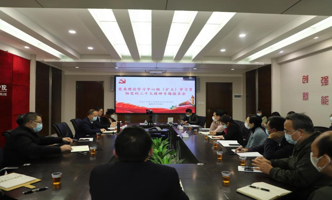 2022年12月8日下午,廣州華立科技職業(yè)學院黨委理論中心組(擴大)在行政樓305會議室舉行第二次學習貫徹黨的二十大精神專題報告會,我院執(zhí)行院長廖良初教授受邀主講。學校黨委書記陳良聲,校長易健民,副書記、副校長高堯來,副校長陳顯強以及各黨總支、直屬黨支部負責人,全體思政課教師、教師黨員代表參加了會議。會議由黨委辦公室主任孟允煌主持。云浮校區(qū)中層以上干部通過視頻連線參加了本次專題學習。