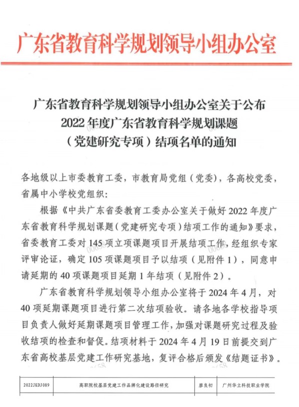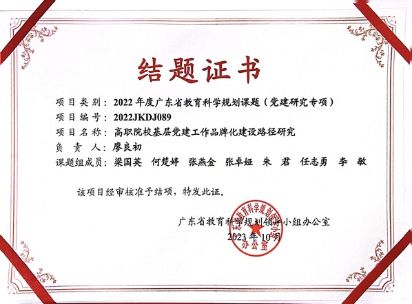近日,廣東省教育科學(xué)規(guī)劃領(lǐng)導(dǎo)小組辦公室近日公布2022年度廣東省教育科學(xué)規(guī)劃課題(黨建研究專項(xiàng))結(jié)項(xiàng)名單,廣東省委教育工委對(duì)145項(xiàng)立項(xiàng)課題項(xiàng)目開展結(jié)項(xiàng)工作,經(jīng)組織專家評(píng)審論證,確定105項(xiàng)立項(xiàng)課題予以結(jié)項(xiàng)。我校馬克思主義學(xué)院廖良初教授主持的《高職院?;鶎狱h建工作品牌化建設(shè)路徑研究》(2022JKDJ089)課題順利結(jié)項(xiàng)。