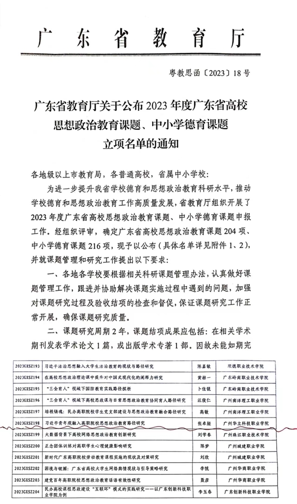 近日,廣東省教育廳公布了2023年度廣東省高校思想政治教育課題、中小學(xué)德育課題項(xiàng)目立項(xiàng)名單。經(jīng)廣東省各地各高校申報(bào),廣東省教育廳組織專家評(píng)審,確定廣東省高校思想政治教育課題204項(xiàng)。其中,我校馬克思主義學(xué)院張卓婭副教授主持的《習(xí)近平青年觀融入高職院校思想政治教育路徑研究》(2022GXSZ198)課題獲得立項(xiàng)。