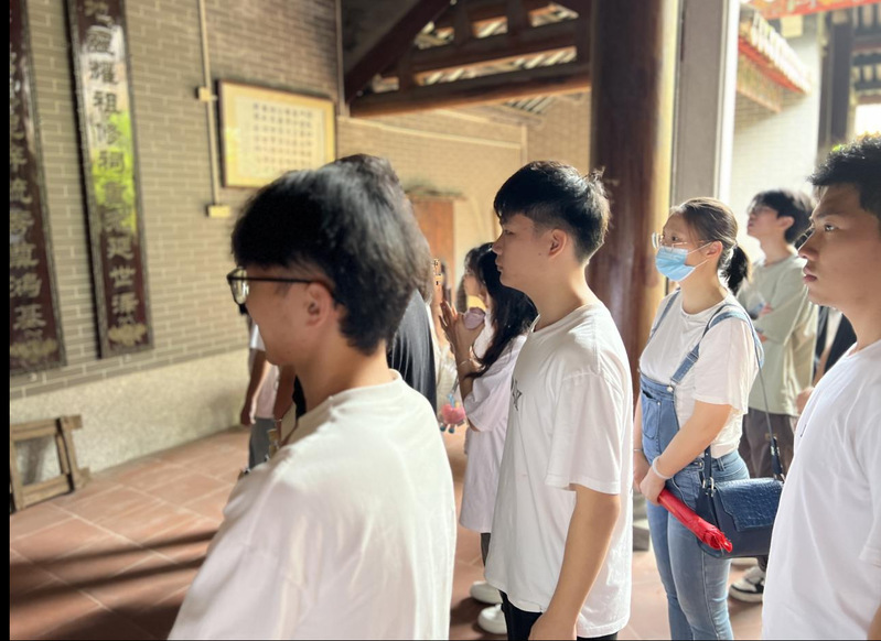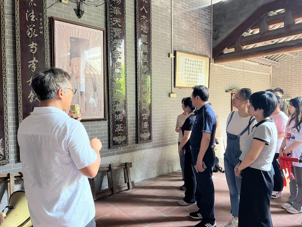在這堂特殊的思政課中,學(xué)生們跟隨老師的步伐,一同走進(jìn)位于增城新塘鎮(zhèn)群星村的篤菴湛公祠。經(jīng)湛氏后裔湛偉健先生的介紹,湛篤菴是新塘湛氏二世祖,其父湛露為新塘湛氏的開宗始祖,其弟湛晚丁的六世孫即為湛若水。篤菴湛公祠見證了湛氏家族的歷史變遷,也承載著湛若水先生的精神遺產(chǎn)。在祠堂內(nèi),學(xué)生們認(rèn)真聆聽湛偉健先生講述湛氏家族的歷史故事,了解了新塘湛氏的起源、二世祖篤菴公的事跡,以及三世祖湛懷德保衛(wèi)鄉(xiāng)民、平息叛亂的忠義之事。隨后,另一位湛氏后裔湛柏欣先生則講述湛若水的生平事跡,了解他一生為學(xué)、為官的堅(jiān)韌與執(zhí)著。